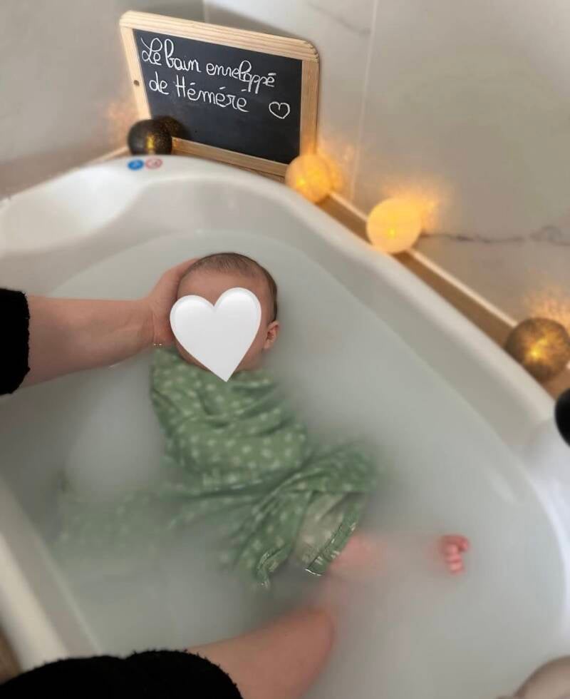Dans une eau chaude et enveloppé d'un lange, bébé découvre des sensations apaisantes proches de celles vécues in utero.